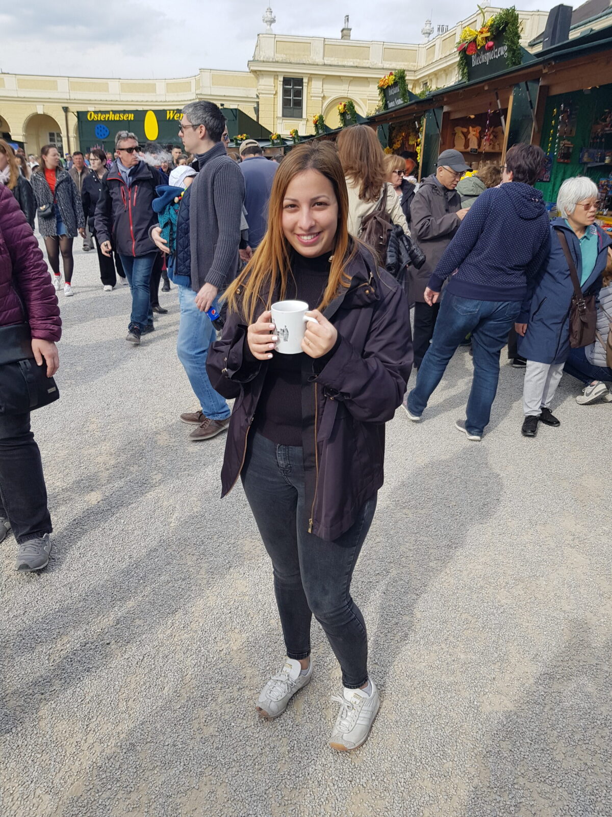 הטיול שלנו מתחיל בנקודה הכי מרשימה בעיר, שוק הפסחא בארמון שנברון (Schönbrunn Palace). עשרות דוכנים מעוצבים עומדים על רקע הארמון הצהוב, עם מוזיקת ג'אז חיה באוויר